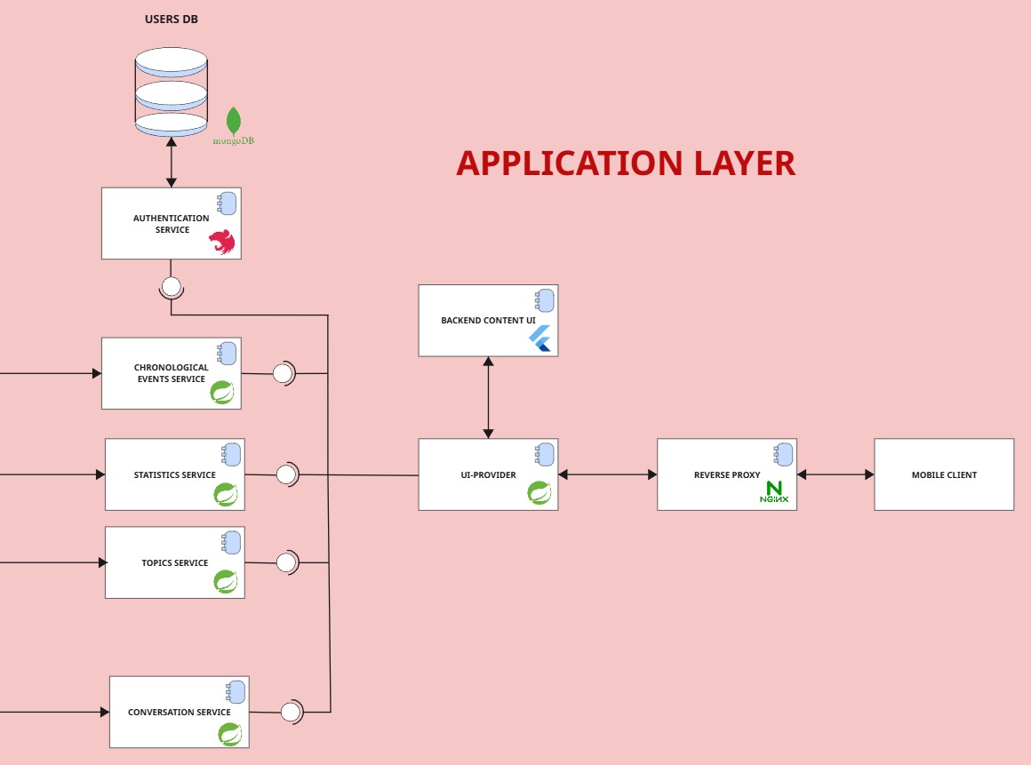 The Application Layer is responsible for managing the design and orchestration mechanisms that enable the cleaned and processed data—originating from the preceding layers—to be consumed, analyzed, and delivered to the end user. This layer incorporates two architectural patterns, Microservices and Backend-Driven UI (BDUI), along with an infrastructure tactic, Reverse Proxy.