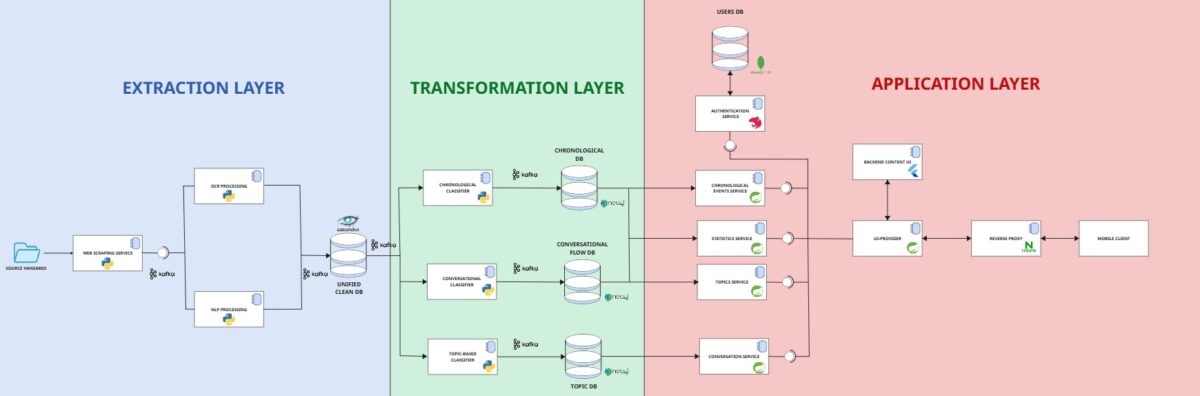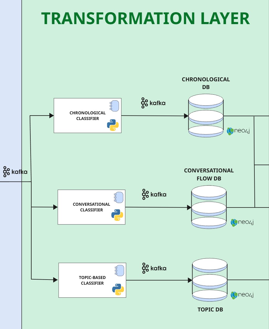 Once the Hansard data has been processed into clean plain text, the Transformation Layer is responsible for converting this information into lighter, summarized, and semantically structured data that supports the functional requirements of HansUp. This layer is composed of three classification components, each designed to process and transform the textual data to feed three graph-based databases implemented in Neo4j. Once again, all communication between the components in this layer is handled asynchronously through Kafka.