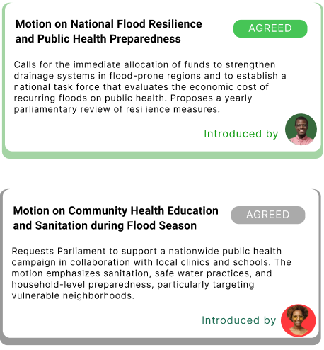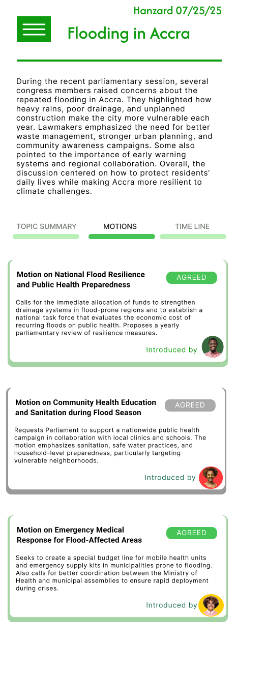 The Motions section mirrors the purpose and structure of the Topic Summary feature. It displays the motions discussed during the selected session, each represented by a card containing the title, concise description, proposing member, and a status indicator denoting whether the motion was approved or rejected.This component is designed to offer a succinct and structured overview of the motions debated, enabling users to quickly grasp the session’s key legislative actions and outcomes