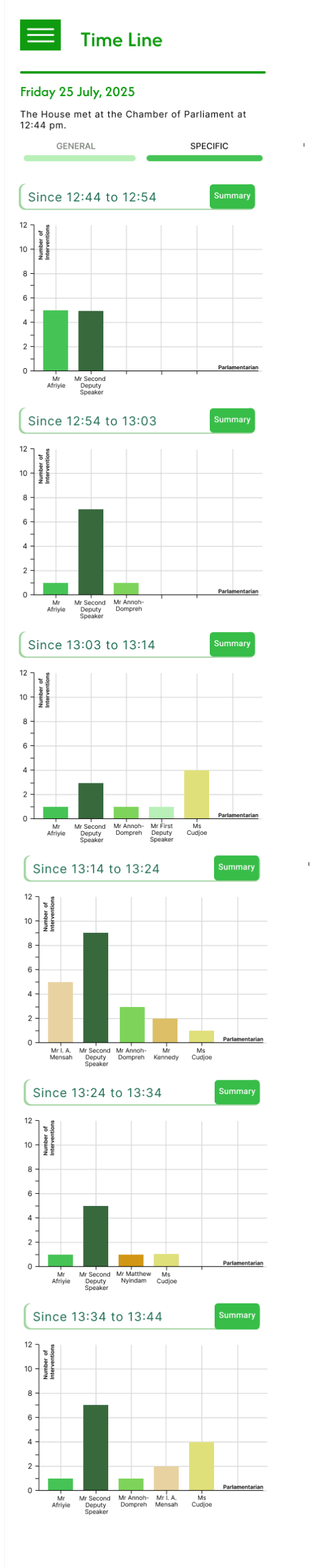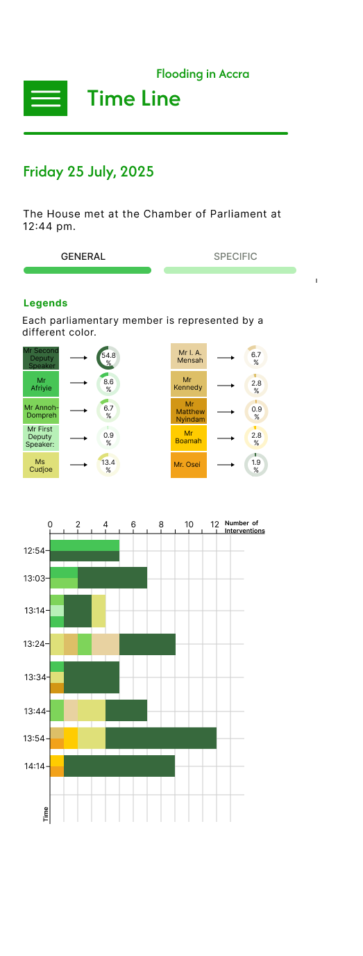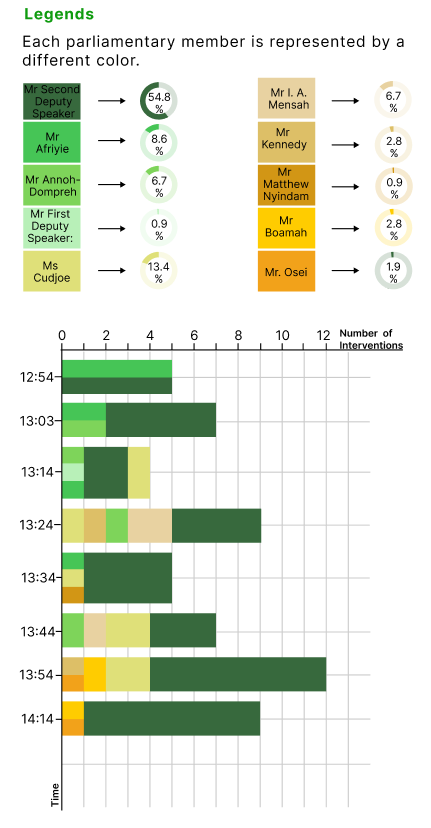 The general overview presents a chronological summary of the session, divided into time intervals of approximately ten minutes each. Within every time frame, the interface highlights the total number of interventions and the members of parliament who participated. This visualization allows users to identify, at a glance, the most active or critical moments of the debate—those characterized by a higher density of participation—and to observe which members were most engaged during those key segments.