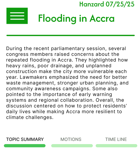 Ghana is recognized as one of the most stable democracies in West Africa. It operates as a presidential republic with a tripartite structure: executive, legislative, and judicial powers, combining elements of customary law and the Anglo-Saxon legal system. Despite its democratic progress, Ghana faces challenges regarding transparency and access to information. Parliamentary debates, officially recorded in the Hansard, are published in flat, hard-to-navigate PDF formats. These documents are essential for political oversight and decision-making, but their current structure prevents efficient searches, automated analysis, and data visualization—limiting citizen participation, journalistic work, and academic research.