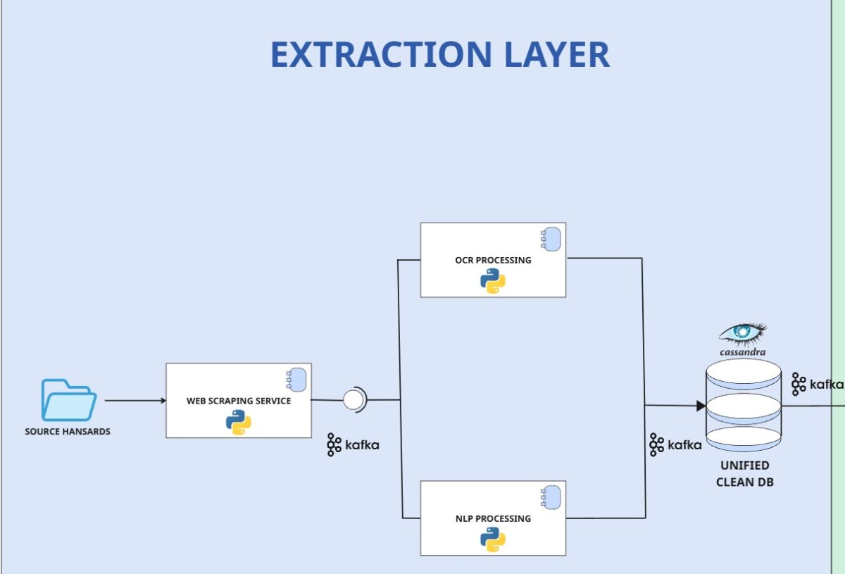 The primary function of this layer is to collect and clean the unstructured data extracted from the Hansards. Through a dedicated web scraping service, the system gathers all the information published on the official website of the Parliament of Ghana. Once the data is collected, it is processed by two specialized components designed to clean and refine the extracted content.