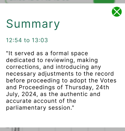 Users can select a topic of interest to access more detailed information about it. This screen first displays the title of the Hansard to which the topic belongs, along with the main theme under discussion. It then provides a more comprehensive summary of the debate, highlighting the key arguments and developments that took place.