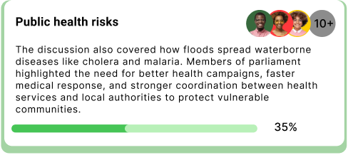 At the bottom of the card, a progress bar visually represents the proportion of total session time devoted to the discussion of that topic, offering an intuitive grasp of its relative importance within the session. Meanwhile, in the upper right corner, the interface displays the members of parliament who contributed to the discussion, providing context on participant engagement and perspectives.