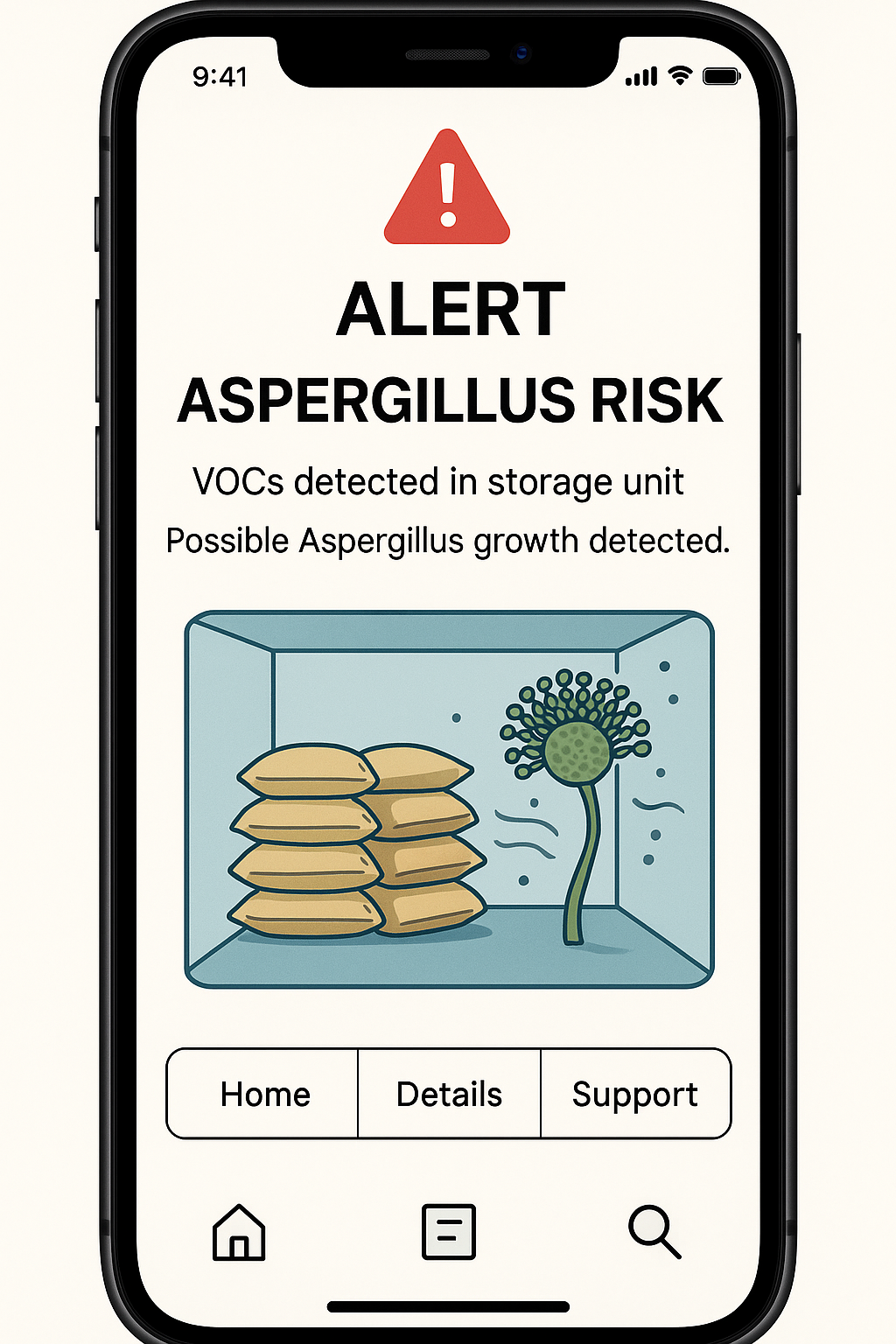 We’re building an AI-powered early warning system using volatile organic compound (VOC) sensors. These sensors detect subtle gas emissions from fungal growth as soon as they appear and before aflatoxins accumulate.
